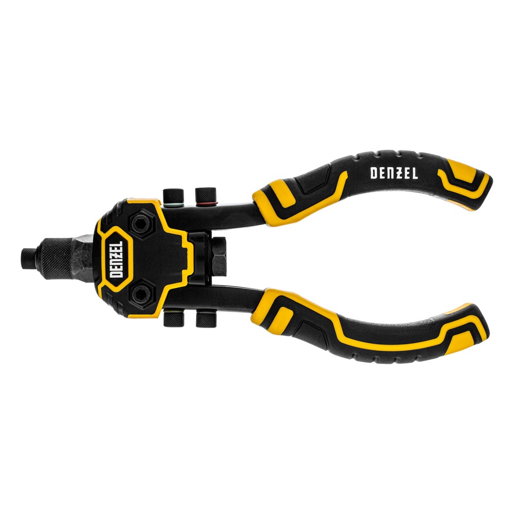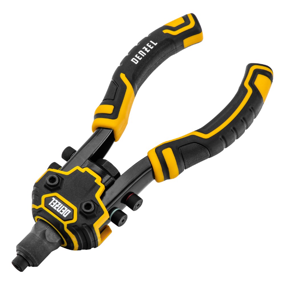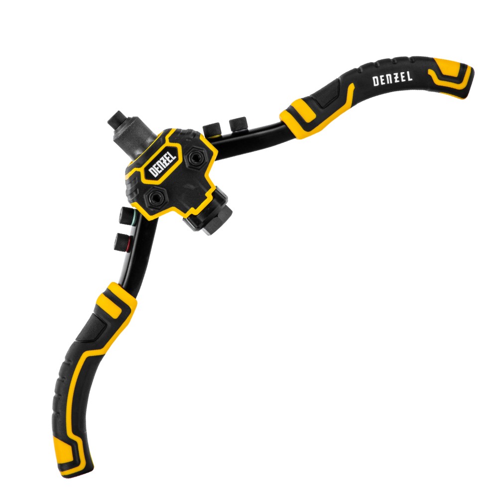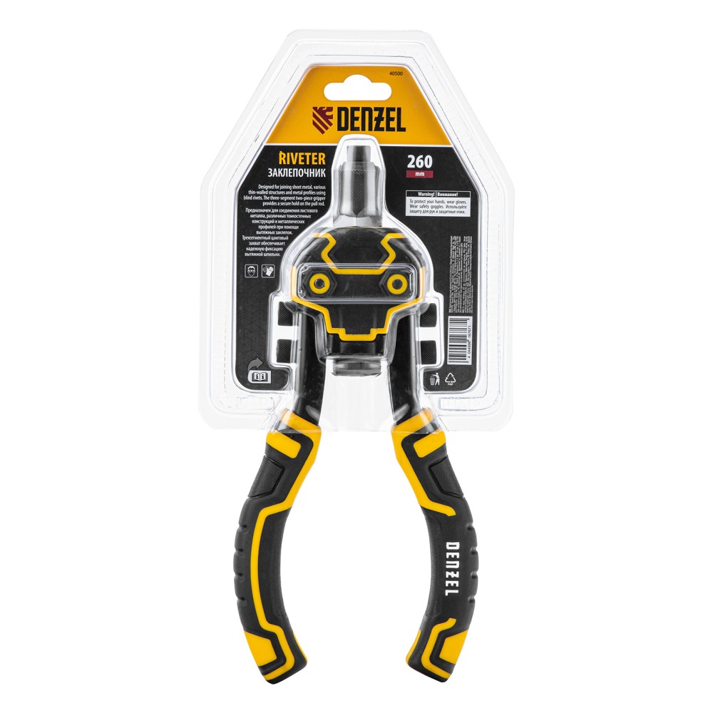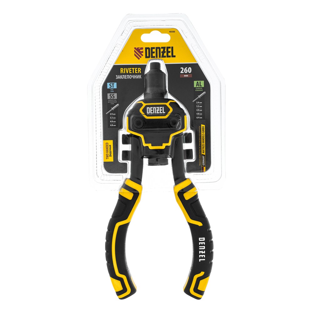 Заклепочник двуручный Denzel 40500 длиной 250 мм предназначен для работы с алюминиевыми и стальными заклепками диаметром 2,4-6,4 мм и 2,4-4,8 мм соответственно. Используется для прочного соединения листовых металлических заготовок, легких конструкций небольшой толщины и металлопрофилей. Двуручный заклепочник требует меньше усилий от пользователя для вытягивания шпильки, поэтому подходит для профессионального применения и выполнения больших объемов работ.ПреимуществаПрочность и коррозионная стойкость — заклепочник изготовлен из хромованадиевой стали.Надежность — цанговый механизм из хромомолибденовой стали выдерживает высокие нагрузки.Высокое качество выполняемых работ — трехсегментный цанговый механизм надежно фиксирует шпильку, не допуская ее перекашивания.Готовность к эксплуатации — к заклепочнику прилагаются насадки для работы с заклепками диаметром 2,4-3,2-4,0-4,8-6,4 мм.Комфортная работа — эргономичные рукоятки с рельефной поверхностью удобно ложатся в руки.