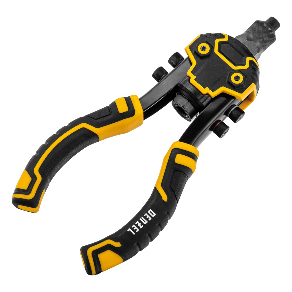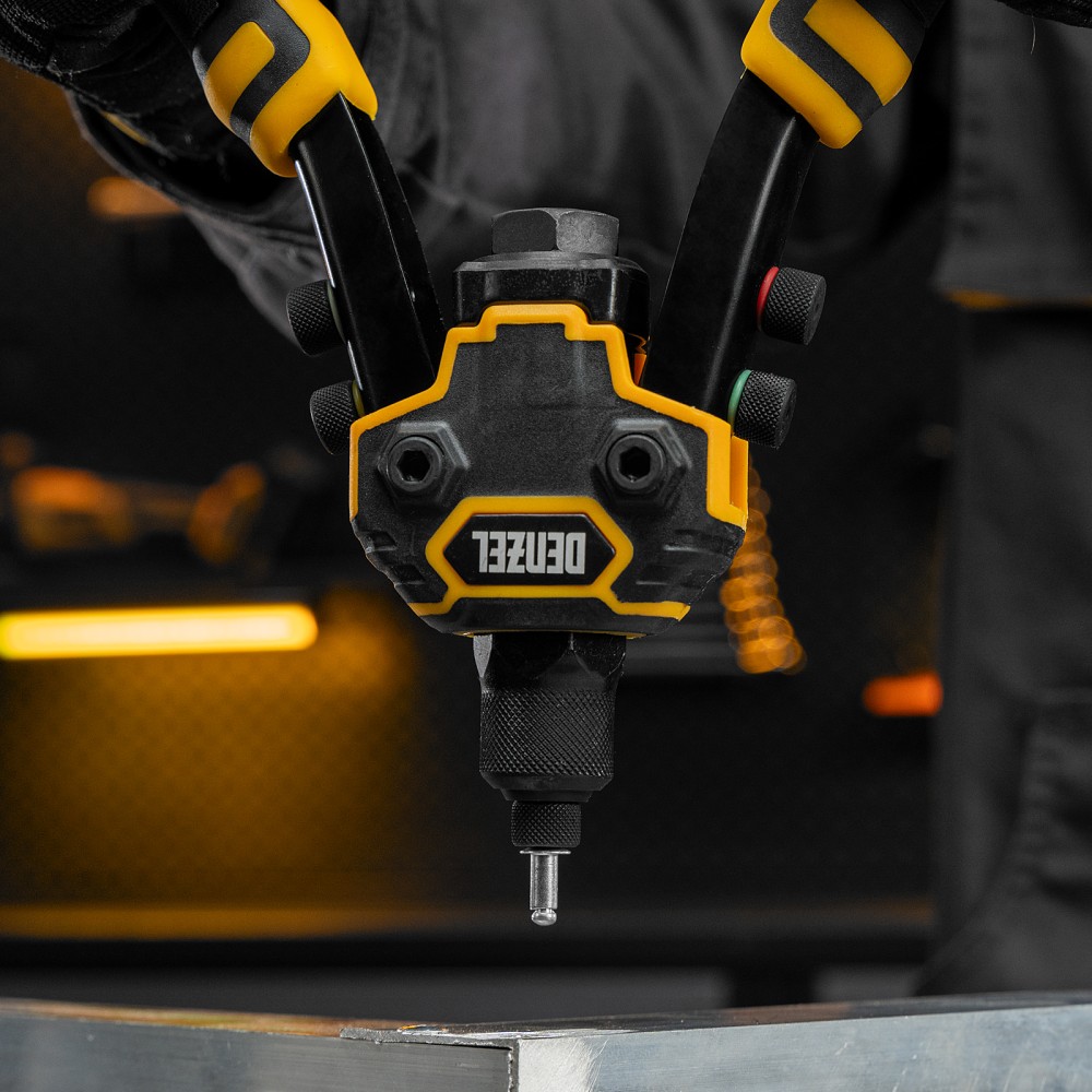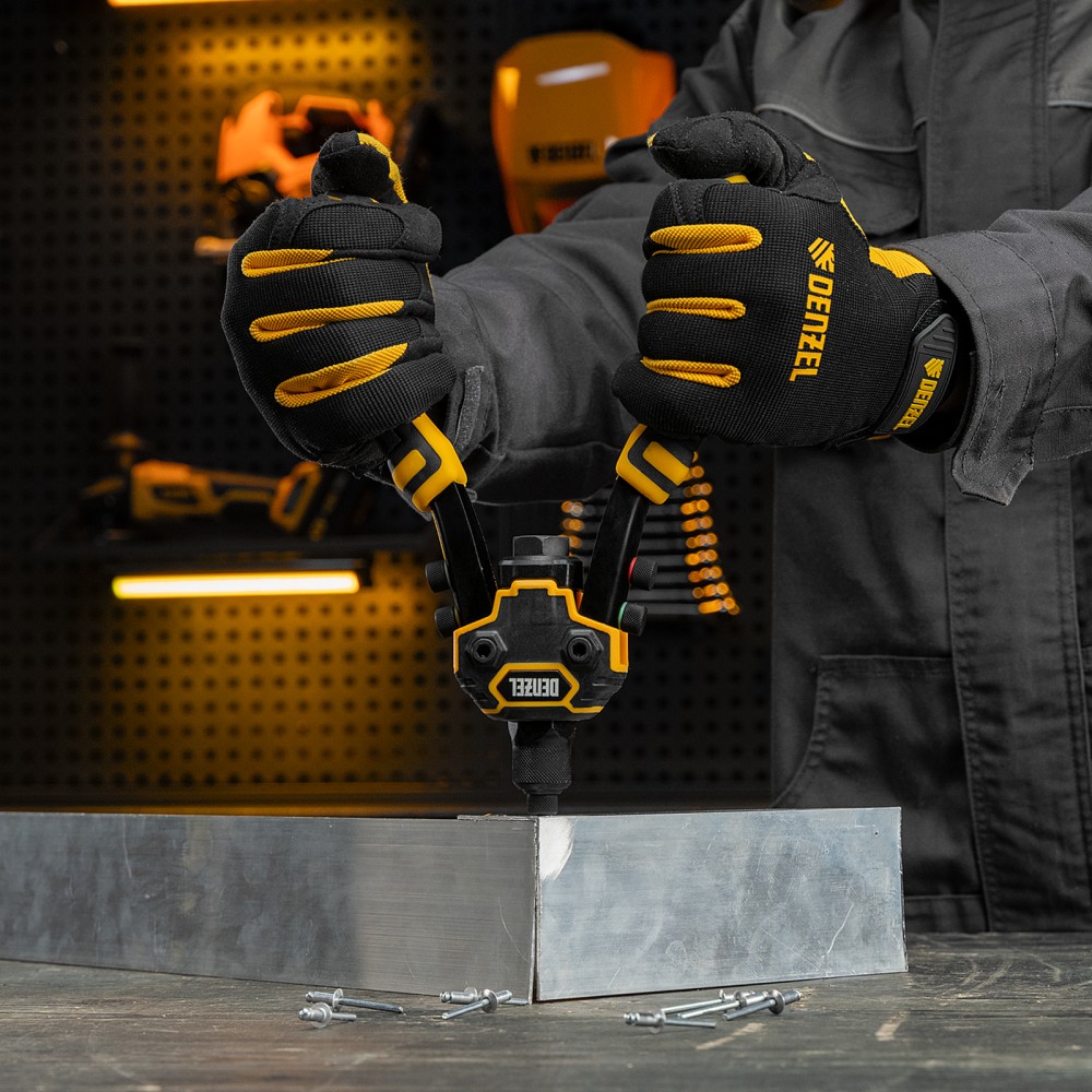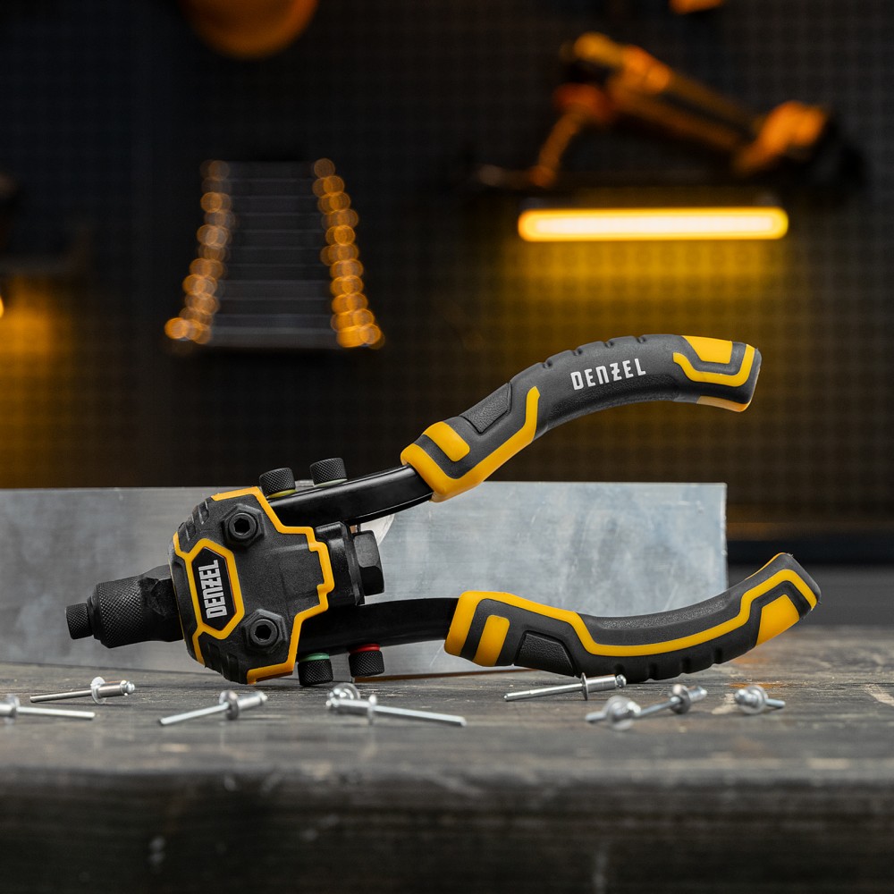 Заклепочник двуручный Denzel 40500 длиной 250 мм предназначен для работы с алюминиевыми и стальными заклепками диаметром 2,4-6,4 мм и 2,4-4,8 мм соответственно. Используется для прочного соединения листовых металлических заготовок, легких конструкций небольшой толщины и металлопрофилей. Двуручный заклепочник требует меньше усилий от пользователя для вытягивания шпильки, поэтому подходит для профессионального применения и выполнения больших объемов работ.ПреимуществаПрочность и коррозионная стойкость — заклепочник изготовлен из хромованадиевой стали.Надежность — цанговый механизм из хромомолибденовой стали выдерживает высокие нагрузки.Высокое качество выполняемых работ — трехсегментный цанговый механизм надежно фиксирует шпильку, не допуская ее перекашивания.Готовность к эксплуатации — к заклепочнику прилагаются насадки для работы с заклепками диаметром 2,4-3,2-4,0-4,8-6,4 мм.Комфортная работа — эргономичные рукоятки с рельефной поверхностью удобно ложатся в руки.