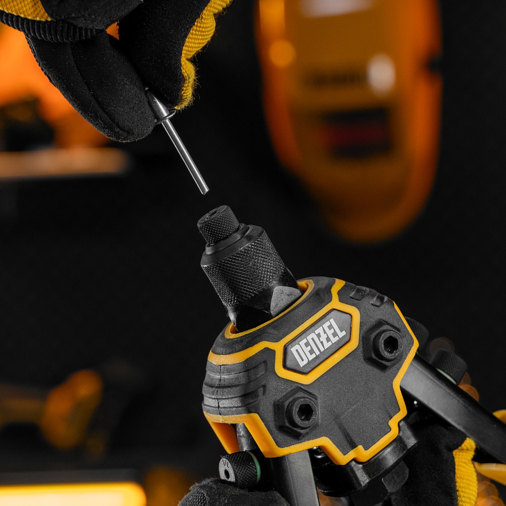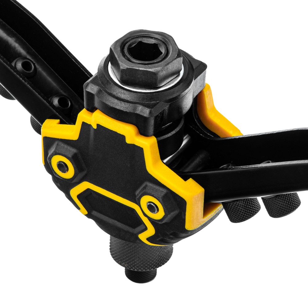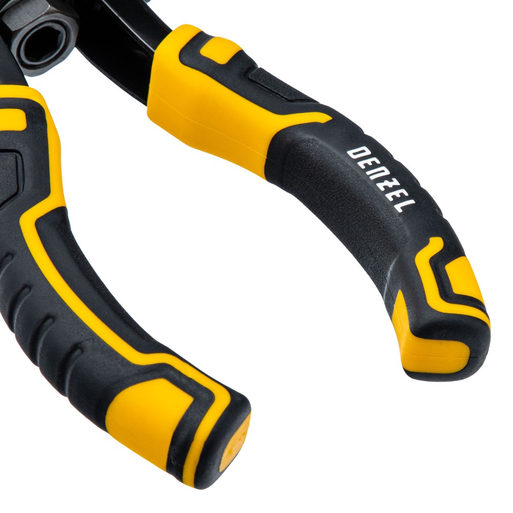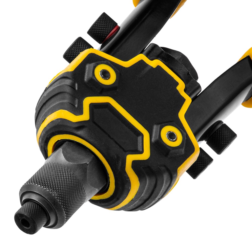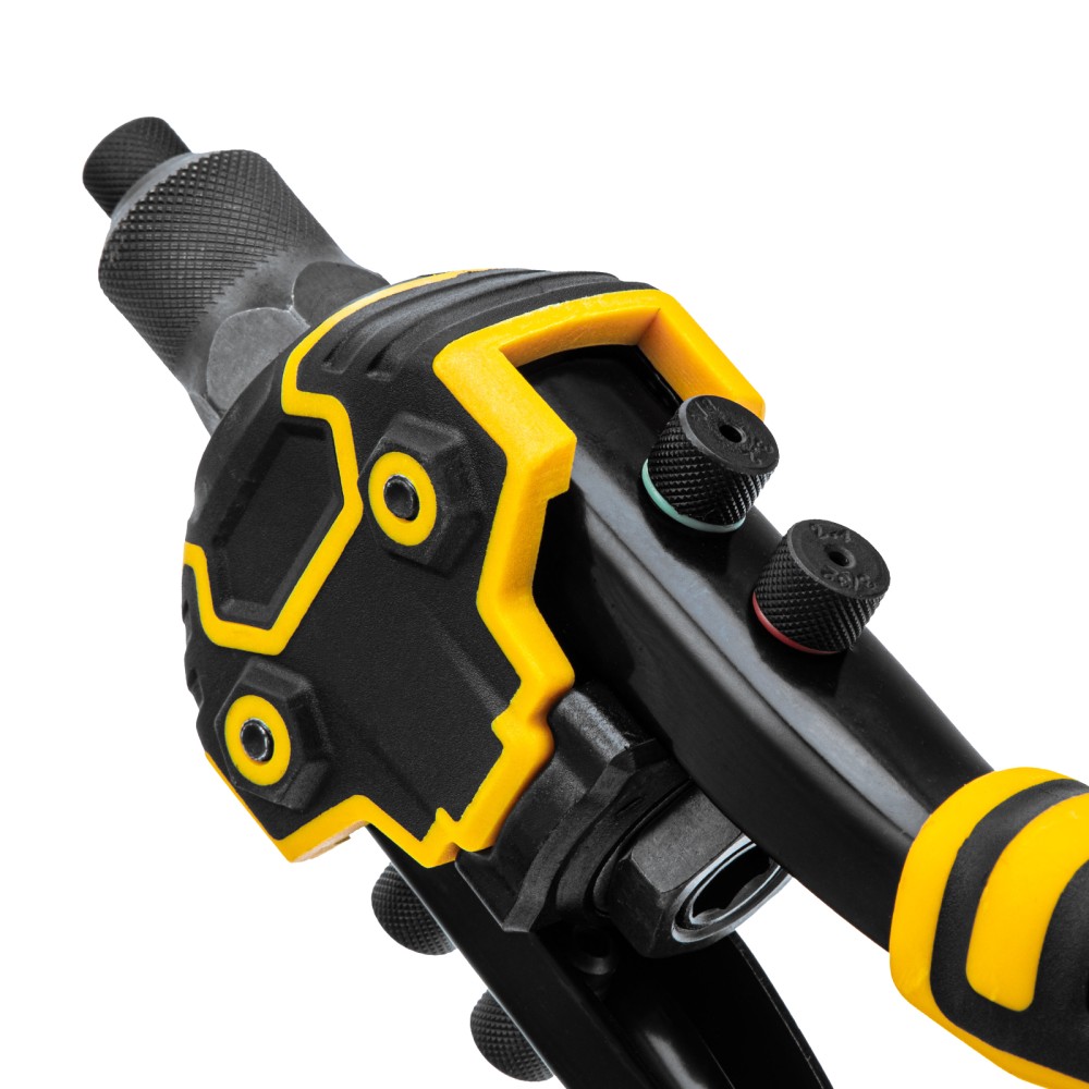 Заклепочник двуручный Denzel 40500 длиной 250 мм предназначен для работы с алюминиевыми и стальными заклепками диаметром 2,4-6,4 мм и 2,4-4,8 мм соответственно. Используется для прочного соединения листовых металлических заготовок, легких конструкций небольшой толщины и металлопрофилей. Двуручный заклепочник требует меньше усилий от пользователя для вытягивания шпильки, поэтому подходит для профессионального применения и выполнения больших объемов работ.ПреимуществаПрочность и коррозионная стойкость — заклепочник изготовлен из хромованадиевой стали.Надежность — цанговый механизм из хромомолибденовой стали выдерживает высокие нагрузки.Высокое качество выполняемых работ — трехсегментный цанговый механизм надежно фиксирует шпильку, не допуская ее перекашивания.Готовность к эксплуатации — к заклепочнику прилагаются насадки для работы с заклепками диаметром 2,4-3,2-4,0-4,8-6,4 мм.Комфортная работа — эргономичные рукоятки с рельефной поверхностью удобно ложатся в руки.