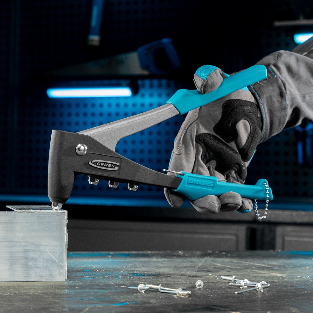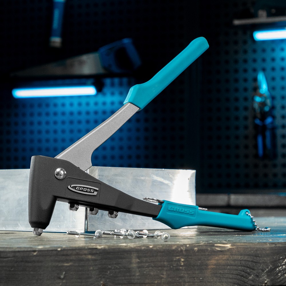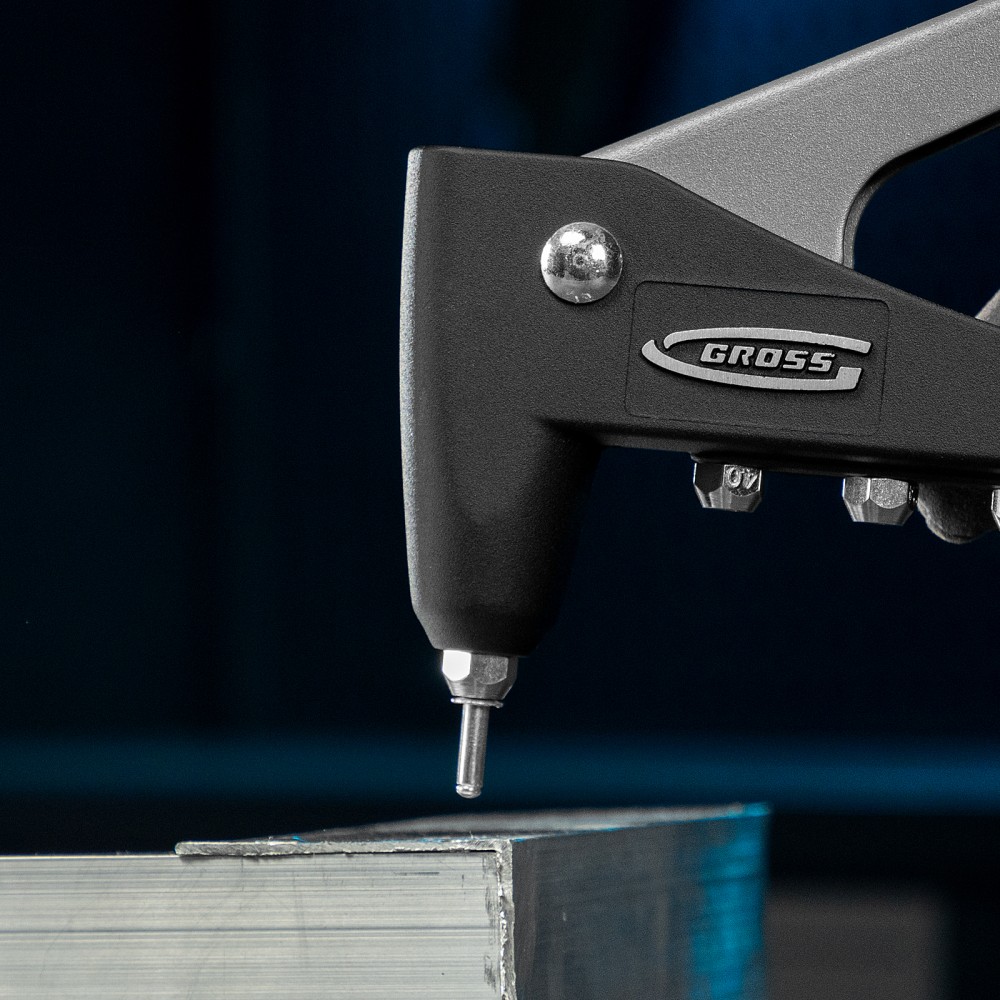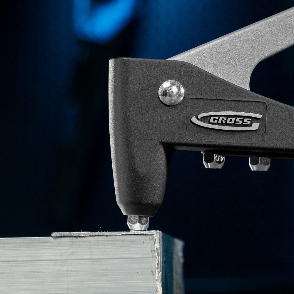 Литой заклепочник Gross 40401 надежно соединяет листовые заготовки при помощи алюминиевых и стальных заклепок размером от 2,4 до 4,8 мм, а также заклепок из нержавеющей стали диаметром 2,4-3,2 мм. В комплекте имеются сменные головки соответствующих размеров. Неиспользуемые насадки располагаются в корпусе инструмента, а значит, не придется тратить время на их поиск. Заклепочник рекомендован для профессионального применения, а также может быть полезен в быту.ПреимуществаСтальной штампованный рычаг и литой корпус обеспечивают устойчивость к нагрузкам и высокий эксплуатационный ресурс заклепочника.Зажимной цанговый механизм захвата заклепок выполнен из хромомолибденовой стали, поэтому характеризуется надежностью и долговечностью.Эргономичные пластиковые рукоятки не скользят в руке, поэтому инструментом удобно работать.Технологические отверстия на внешней стороне рычага позволяют быстро подобрать соединительные элементы нужного размера.Заклепочник произведен на специализированном тайваньском заводе по немецкой технологии, что доказывает его высокое качество.