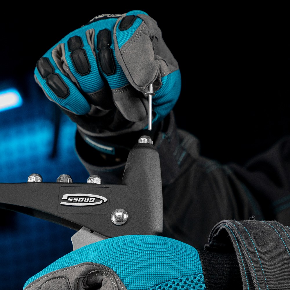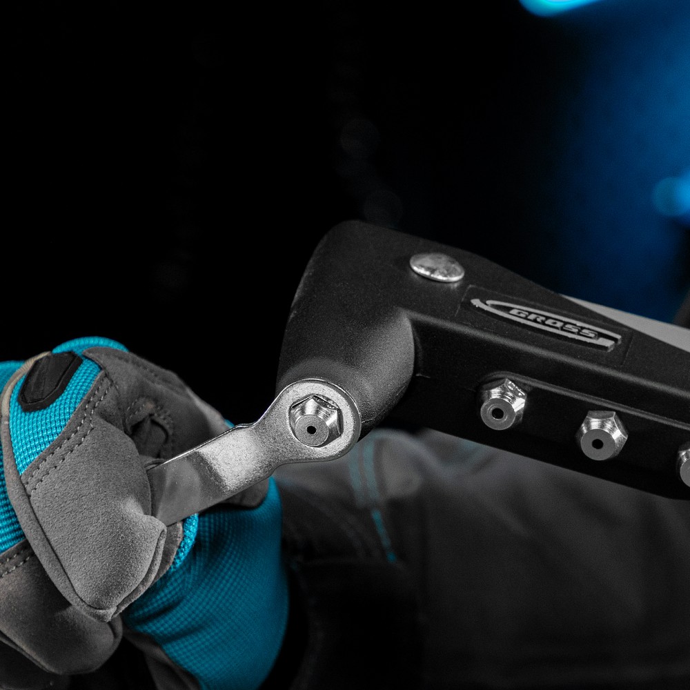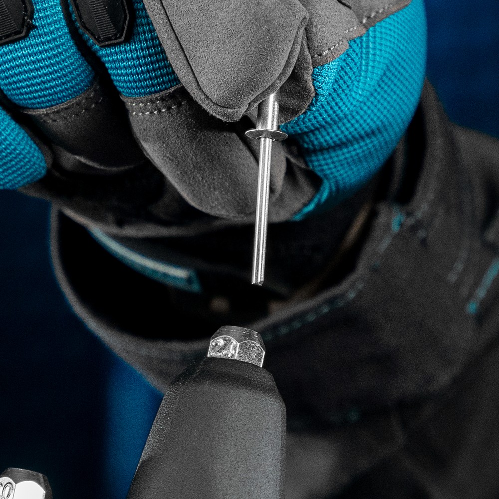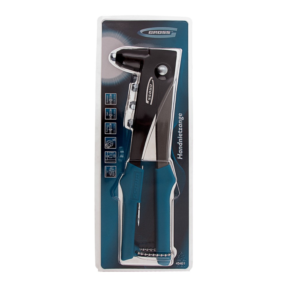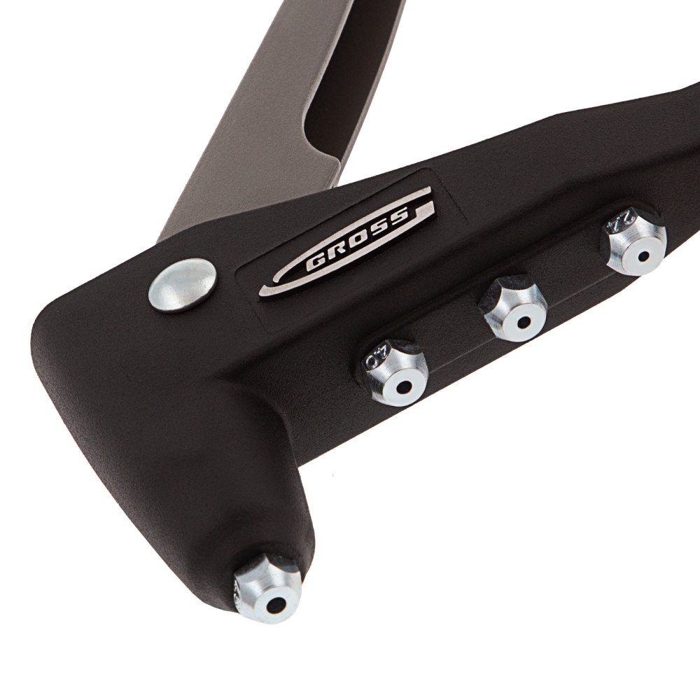 Литой заклепочник Gross 40401 надежно соединяет листовые заготовки при помощи алюминиевых и стальных заклепок размером от 2,4 до 4,8 мм, а также заклепок из нержавеющей стали диаметром 2,4-3,2 мм. В комплекте имеются сменные головки соответствующих размеров. Неиспользуемые насадки располагаются в корпусе инструмента, а значит, не придется тратить время на их поиск. Заклепочник рекомендован для профессионального применения, а также может быть полезен в быту.ПреимуществаСтальной штампованный рычаг и литой корпус обеспечивают устойчивость к нагрузкам и высокий эксплуатационный ресурс заклепочника.Зажимной цанговый механизм захвата заклепок выполнен из хромомолибденовой стали, поэтому характеризуется надежностью и долговечностью.Эргономичные пластиковые рукоятки не скользят в руке, поэтому инструментом удобно работать.Технологические отверстия на внешней стороне рычага позволяют быстро подобрать соединительные элементы нужного размера.Заклепочник произведен на специализированном тайваньском заводе по немецкой технологии, что доказывает его высокое качество.