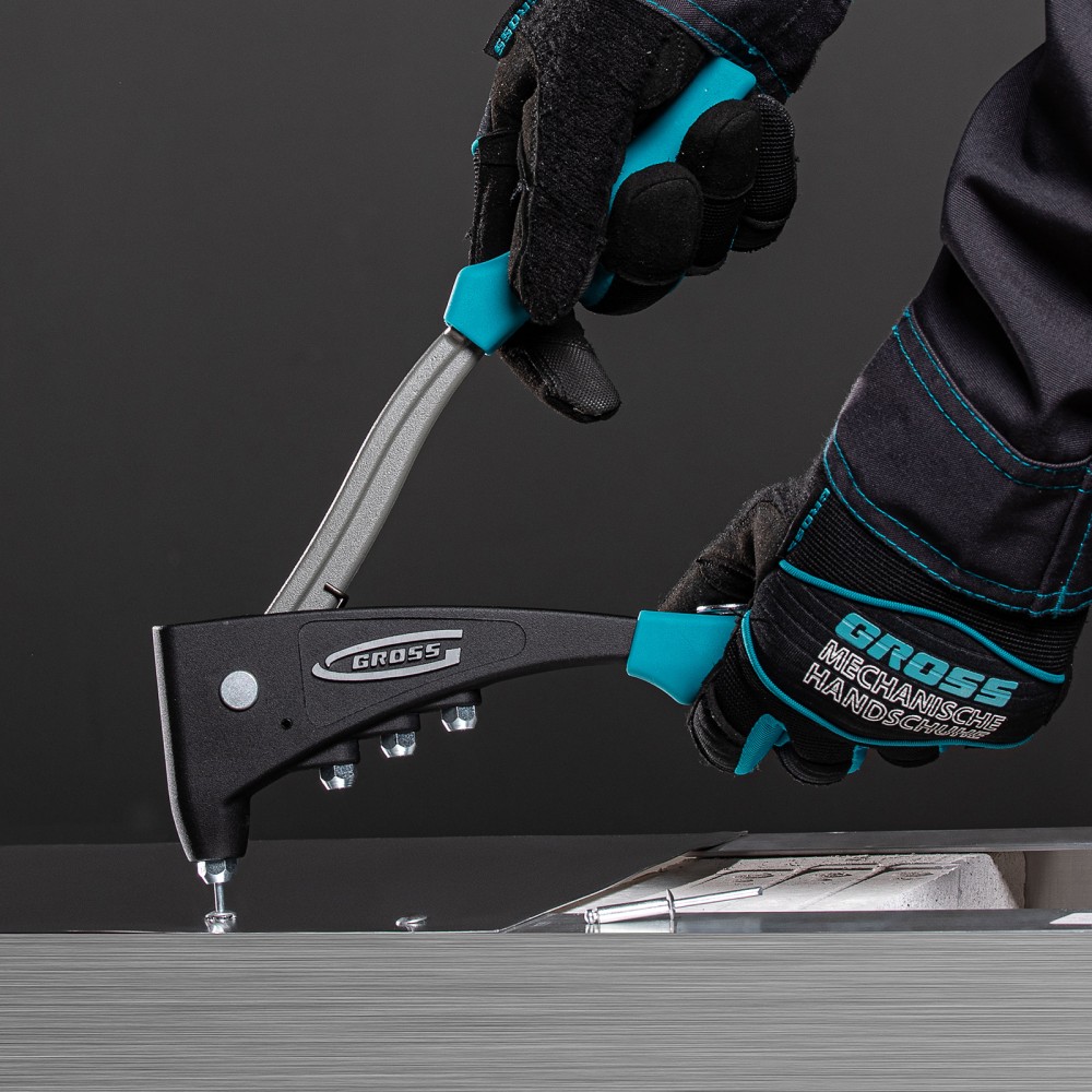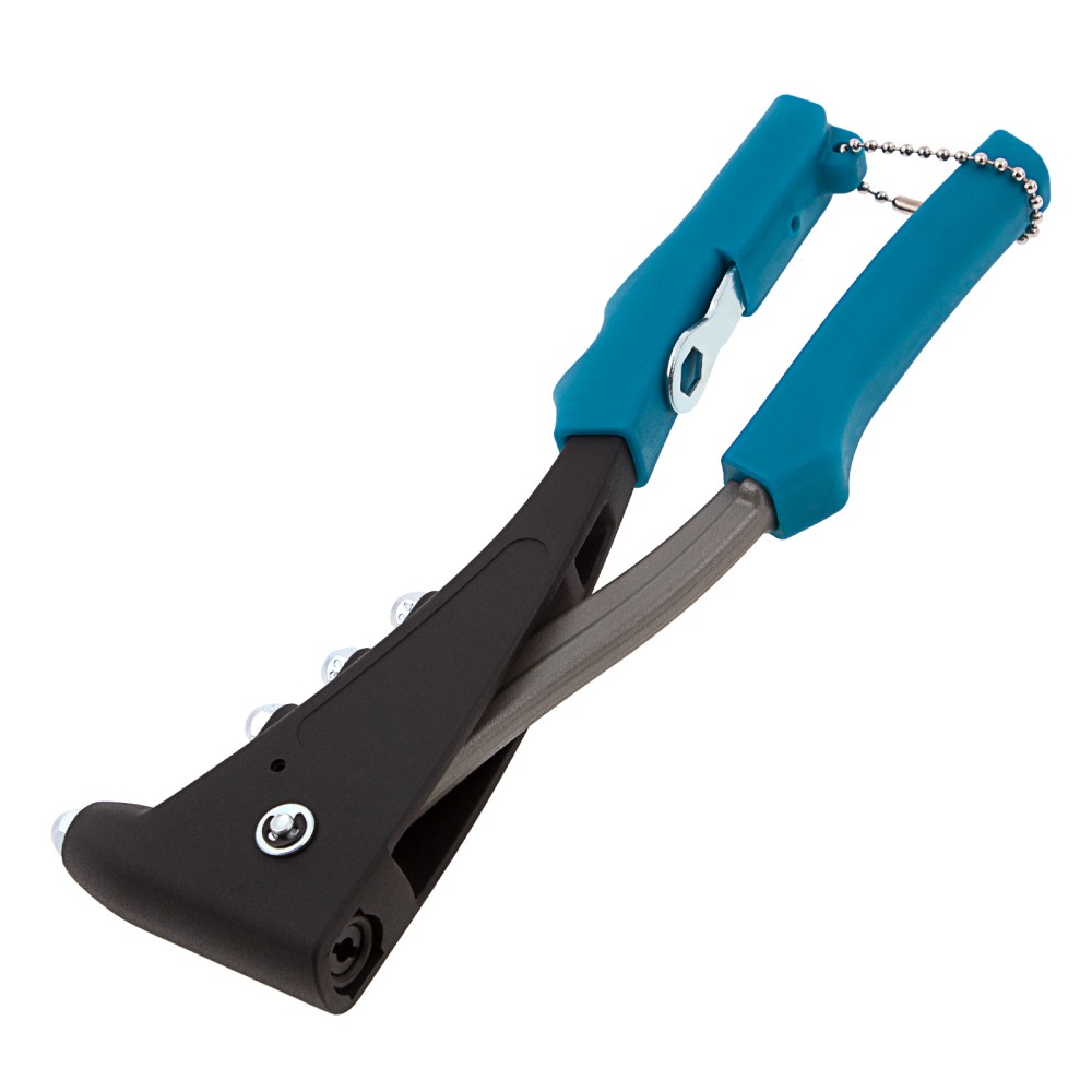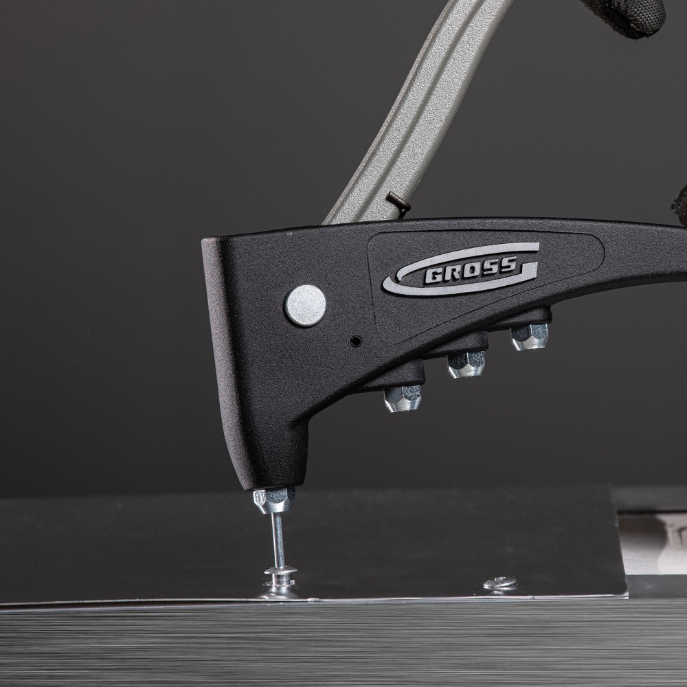 Литой усиленный заклепочник Gross 40403 для заклепок диаметром 2,4-4,8 мм применяется для надежного соединения плоских заготовок и деталей. Для этого используются стальные и алюминиевые заклепки или заклепки из нержавеющей стали. Для установки крепежа не требуется особых усилий благодаря кованому изогнутому рычагу. Инструмент используется в строительстве, при производстве мебели и техники, для соединения листового металла и т.д.ПреимуществаЦанговый механизм для захвата заклепок выполнен из высоколегированной стали CrMo, устойчивой к коррозии и обладающей высокой прочностью.В комплекте имеются сменные насадки, фиксирующиеся на корпусе заклепочника, это позволяет быстро выбрать и установить нужную.Ключ для смены насадок хранится в кармане на рукоятке, поэтому он всегда под рукой.Нескользящие рукоятки из термопластичной резины обеспечивают комфорт во время работы.Заклепочник изготовлен в Тайване, имеет литой корпус и штампованный рычаг из стали, характеризуется высоким качеством и надежностью.