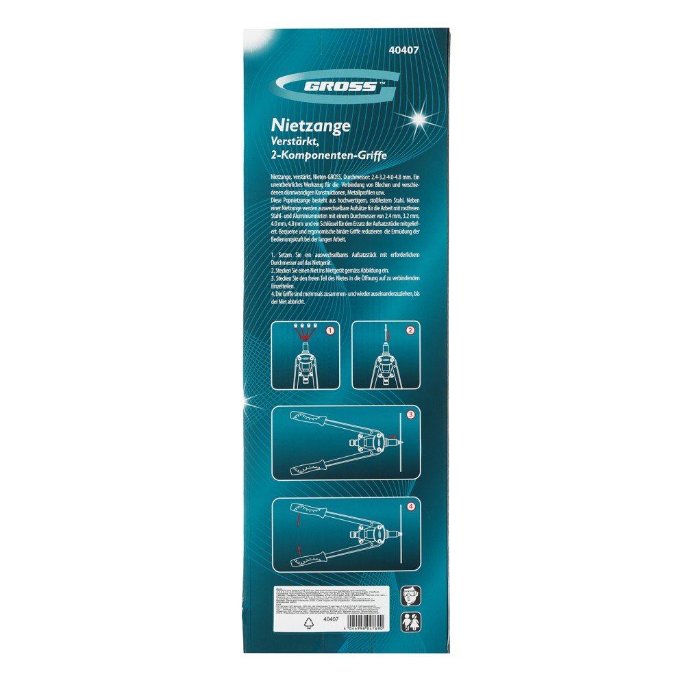 Заклёпочник двуручный Gross 40407 с двухкомпонентными рукоятками, 420 мм, предназначен для соединения листовых заготовок, металлопрофиля, легких строительных конструкций и плоских деталей. Применяется с алюминиевыми, стальными и нержавеющими заклёпками 2,4-3,2-4,0-4,8 мм, для которых предусмотрены сменные насадки. Заклёпочник используется при проведении строительных и ремонтных работ, в производстве мебели, бытовой и оргтехники, а также для ремонта автомобилей.ПреимуществаЦанговый механизм устойчив к механическим нагрузкам и обеспечивает надёжный захват стержня заклёпки, поскольку изготовлен из высокопрочной хромомолибденовой стали SCM415.Для быстрой замены головок в комплекте предусмотрен монтажный ключ.Эргономичные рукоятки позволяют снизить нагрузку на руки при длительной работе.
