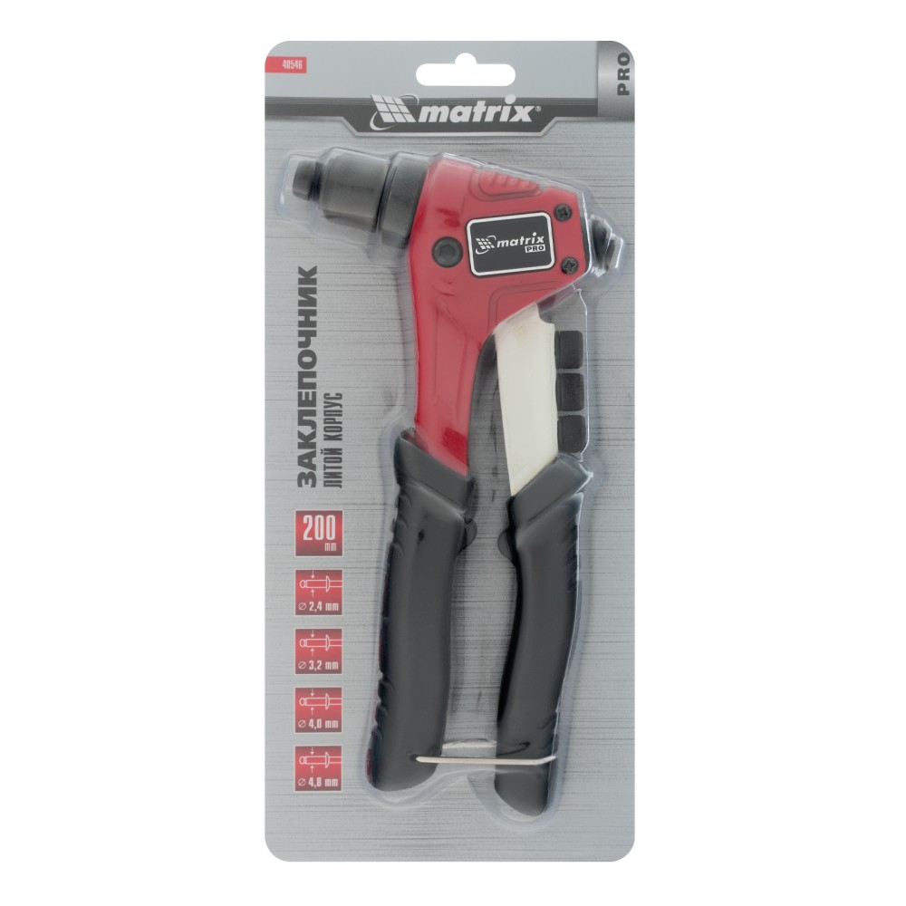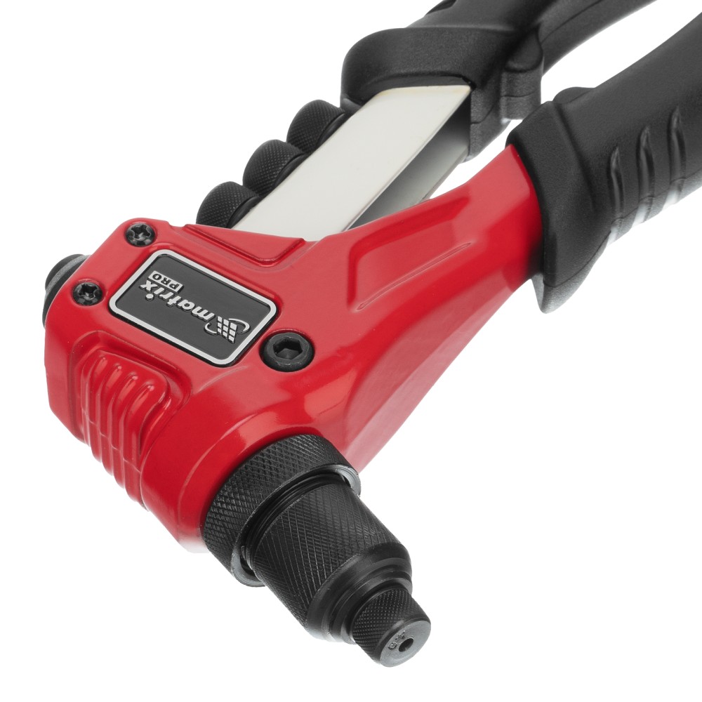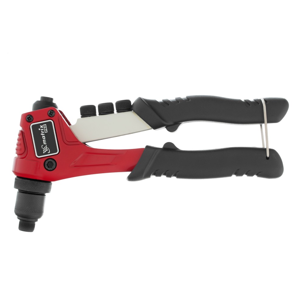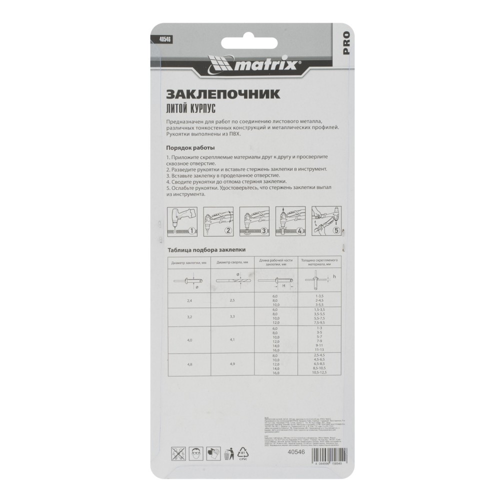 Ручной литой заклепочник Matrix PRO 40546 длиной 200 мм позволяет выполнять скрепление металлических заготовок с помощью вытяжных заклепок диаметром 2,4-3,2-4,0-4,8 мм. Метод сквозного монтажа на вытяжные заклепки обеспечивает прочность и надежность соединений. Инструмент пригодится как частным мастерам, так и профессионалам при проведении ремонта, установке забора и т.д.ПреимуществаДолговечность и работа без усталости — литой алюминиевый корпус сочетает в себе прочность и малый вес 528 г.Эргономичные рукоятки — инструмент не проскальзывает в руках благодаря рельефным накладкам из ПВХ и ограничительным упорам.Надежность закрепления заклепок — трехсегментный вытяжной цанговый захват выполнен из прочной хромомолибденовой стали.Насадки в комплекте — можно работать с заклепками различного диаметра.Удобство хранения и транспортировки — на инструменте имеется кольцо для удержания рукояток в закрытом состоянии.