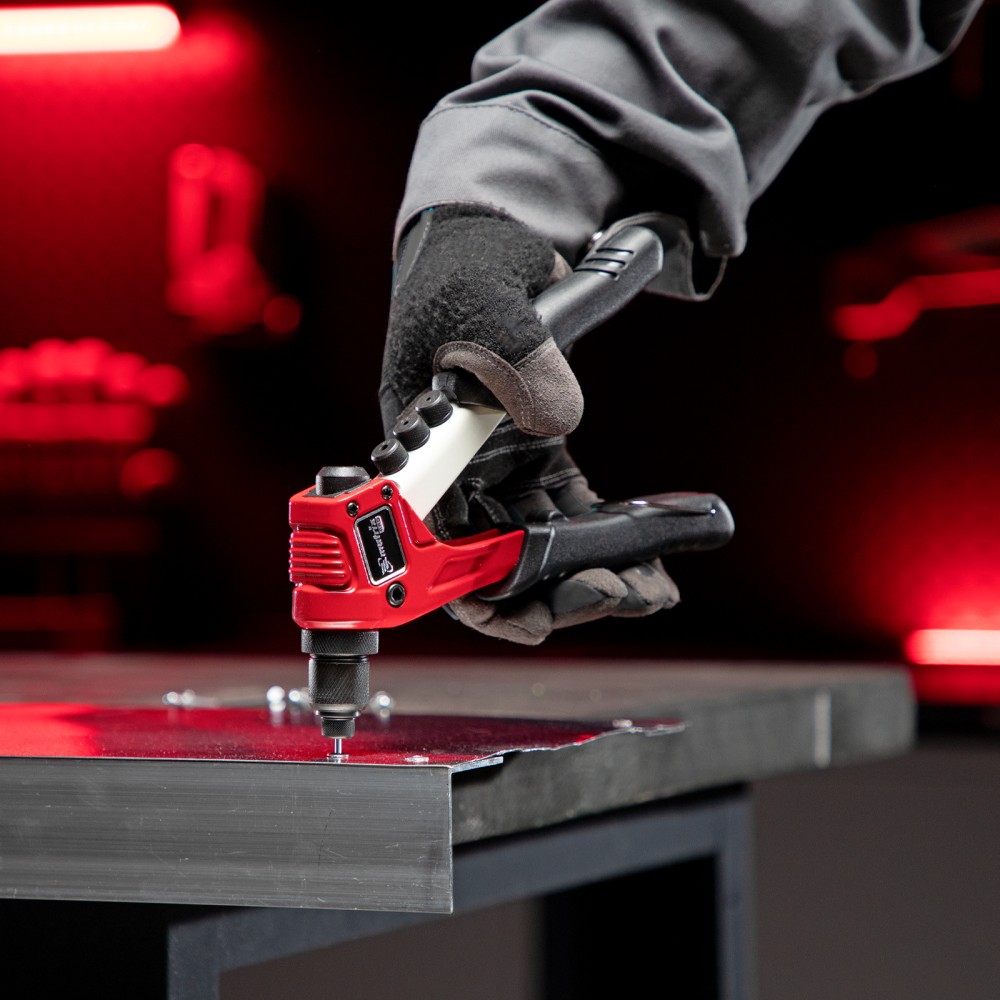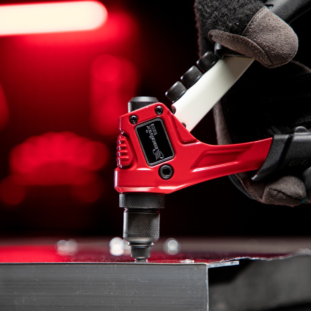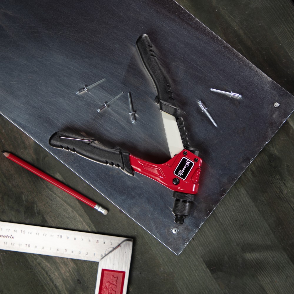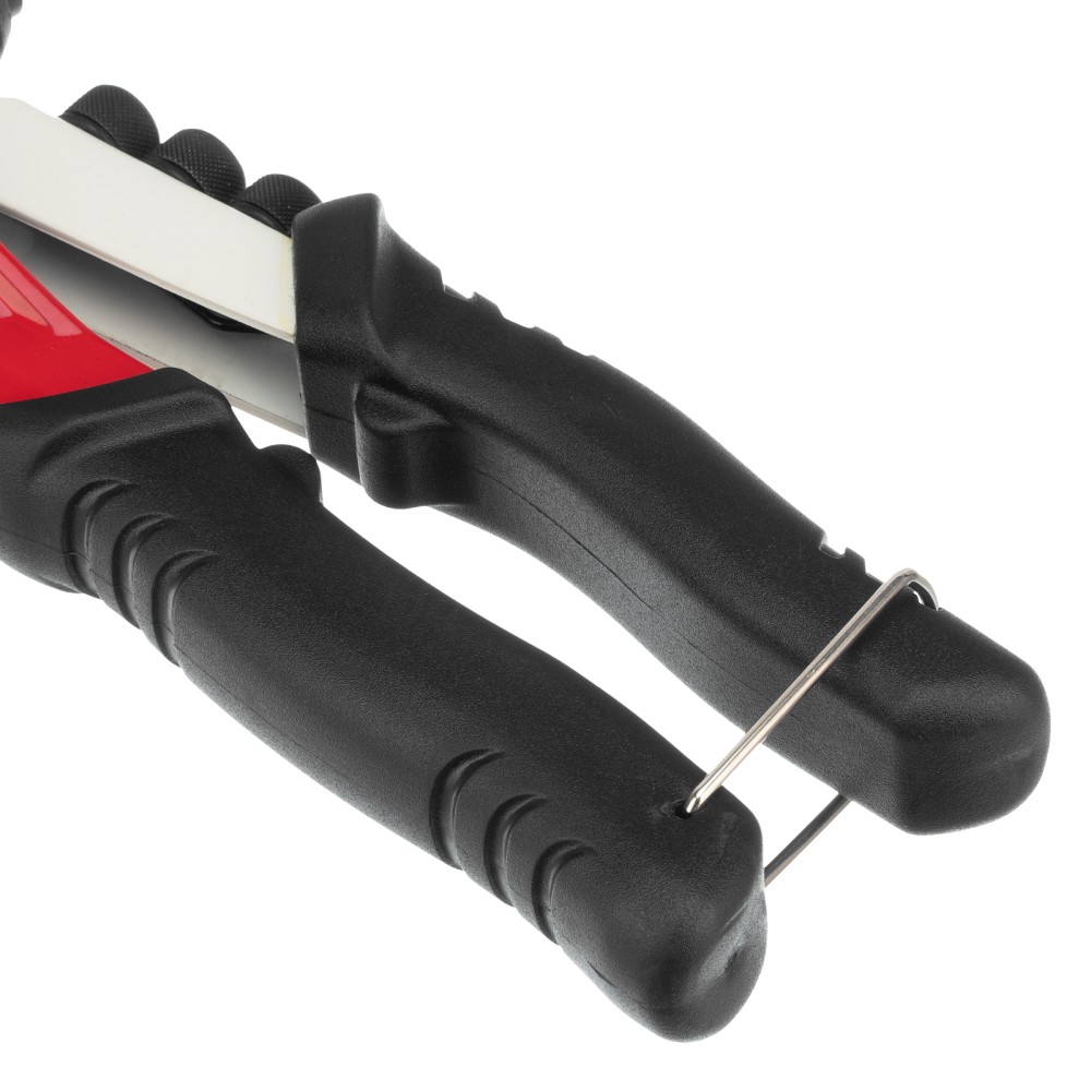 Ручной литой заклепочник Matrix PRO 40546 длиной 200 мм позволяет выполнять скрепление металлических заготовок с помощью вытяжных заклепок диаметром 2,4-3,2-4,0-4,8 мм. Метод сквозного монтажа на вытяжные заклепки обеспечивает прочность и надежность соединений. Инструмент пригодится как частным мастерам, так и профессионалам при проведении ремонта, установке забора и т.д.ПреимуществаДолговечность и работа без усталости — литой алюминиевый корпус сочетает в себе прочность и малый вес 528 г.Эргономичные рукоятки — инструмент не проскальзывает в руках благодаря рельефным накладкам из ПВХ и ограничительным упорам.Надежность закрепления заклепок — трехсегментный вытяжной цанговый захват выполнен из прочной хромомолибденовой стали.Насадки в комплекте — можно работать с заклепками различного диаметра.Удобство хранения и транспортировки — на инструменте имеется кольцо для удержания рукояток в закрытом состоянии.
