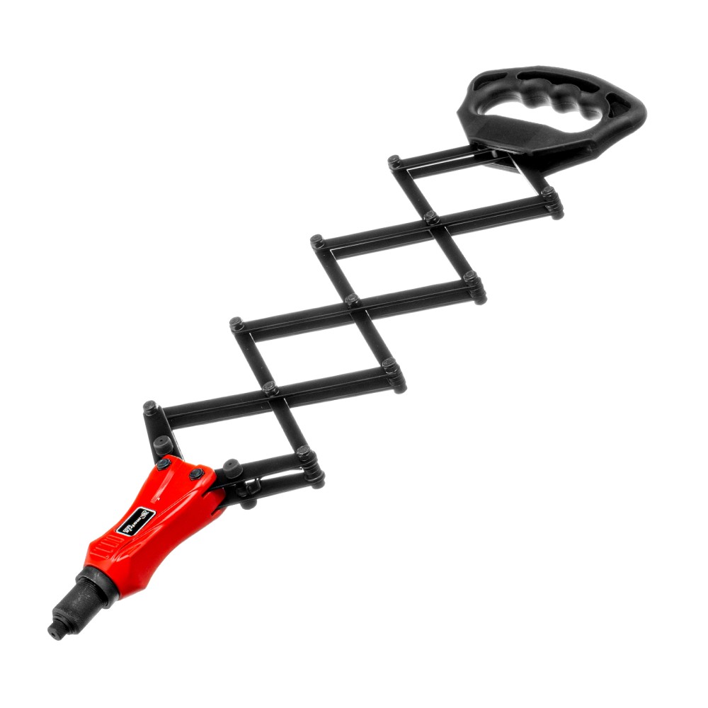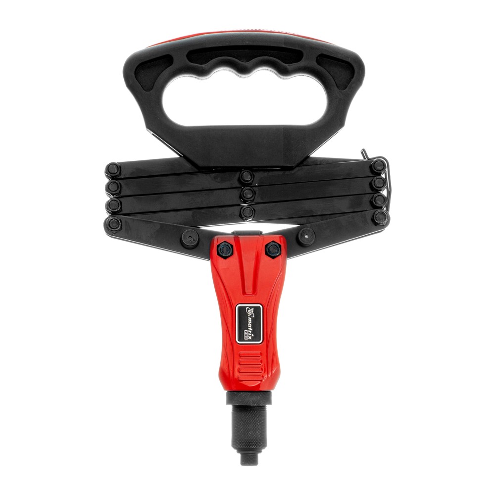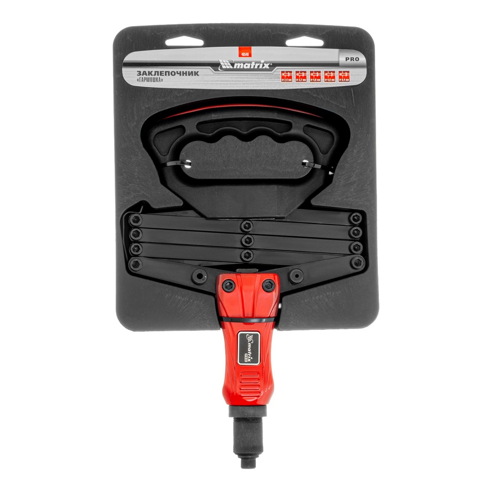 Усиленный ручной заклепочник Matrix PRO «Гармошка» 40548 позволяет соединять металлические листы и профили при помощи вытяжных заклепок диаметром 2,4-3,2-4,0-4,8-6,4 мм. В комплект поставки входят сменные головки соответствующих размеров. Прижимной механизм в виде пантографа экономит усилия, облегчая интенсивную работу. Инструмент используется в строительстве, на производстве и в ремонтных мастерских, а также пригодится в быту.ПреимуществаПрочность и долговечность — литой корпус изготовлен из алюминиевого сплава, а цанговый механизм — из прочной хромомолибденовой стали.Надежная фиксация крепежа — трехлепестковый зажимной механизм крепко удерживает вытяжной стержень заклепкиУдобное хранение и транспортировка — прижимной механизм удерживается в сложенном состоянии при помощи металлической скобы.