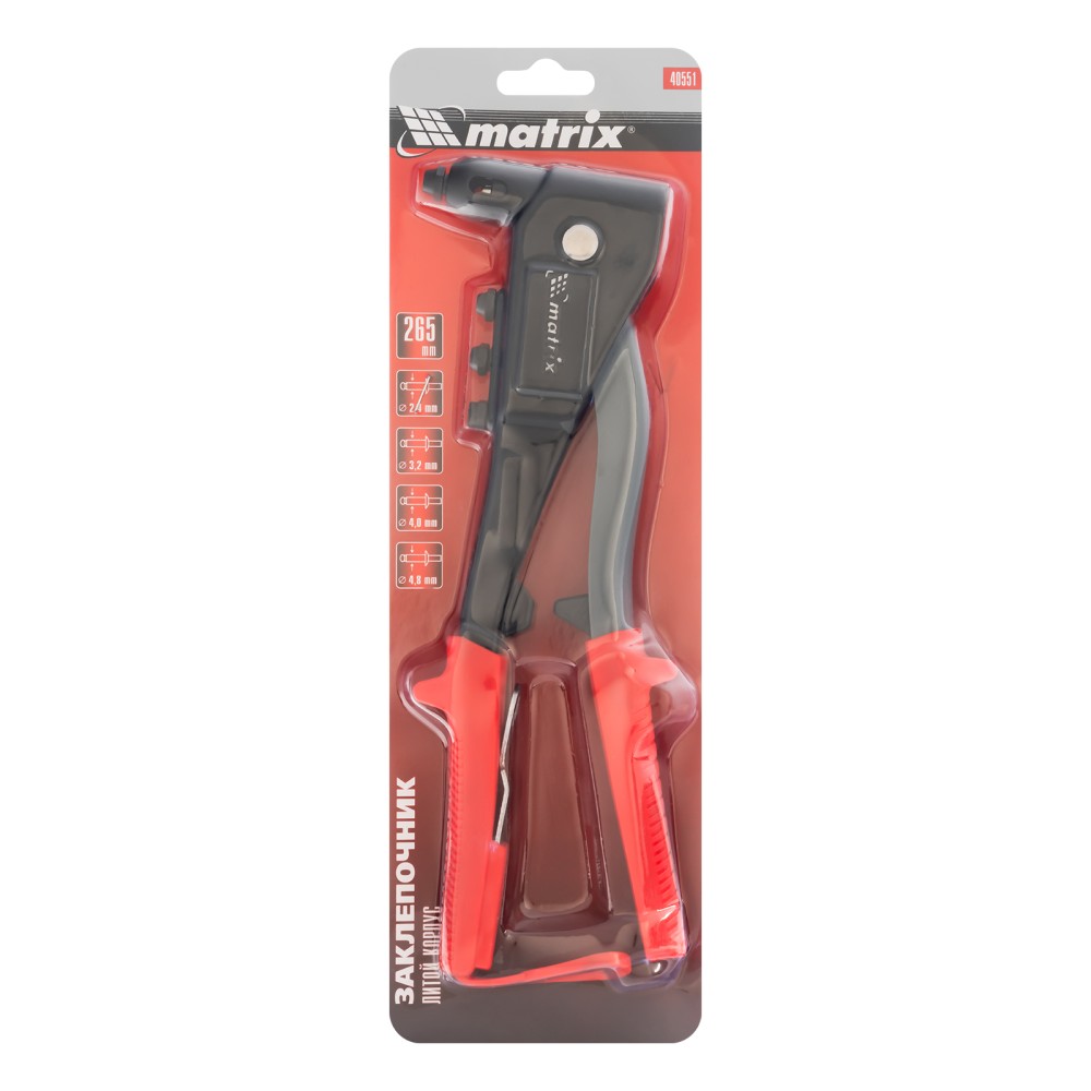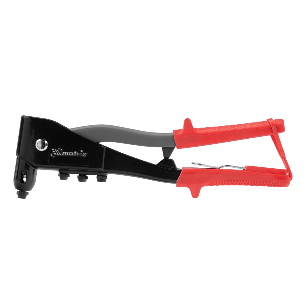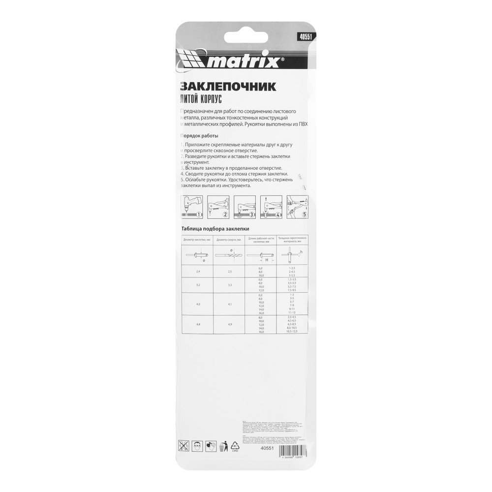 Литой заклепочник Matrix 40551 длиной 260 мм формирует прочные неразъемные соединения металлических листов и профилей. Используется с заклепками диаметром 2,4-3,2-4,0-4,8 мм, для которых предусмотрены сменные насадки соответствующих размеров. Инструмент применяется в строительстве, во время ремонта, сборки мебели и техники, а также полезен в быту.ПреимуществаНадежность и долговечность — инструмент изготовлен из алюминиевого сплава, устойчивого к коррозии и повреждениям.Эффективная работа — двухсегментный цанговый механизм из хромомолибденовой стали крепко захватывает вытяжную шпильку заклепки.Удобное хранение сменных насадок — для них предусмотрены специальные гнезда на корпусе.Фиксация рукояток в нерабочем положении — инструмент удобен для хранения и транспортировки.Комфортная работа — рифленые рукоятки не выскальзывают из ладони.