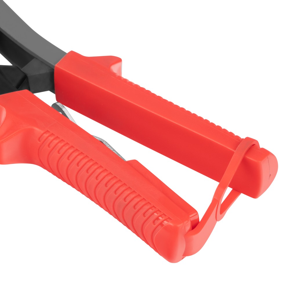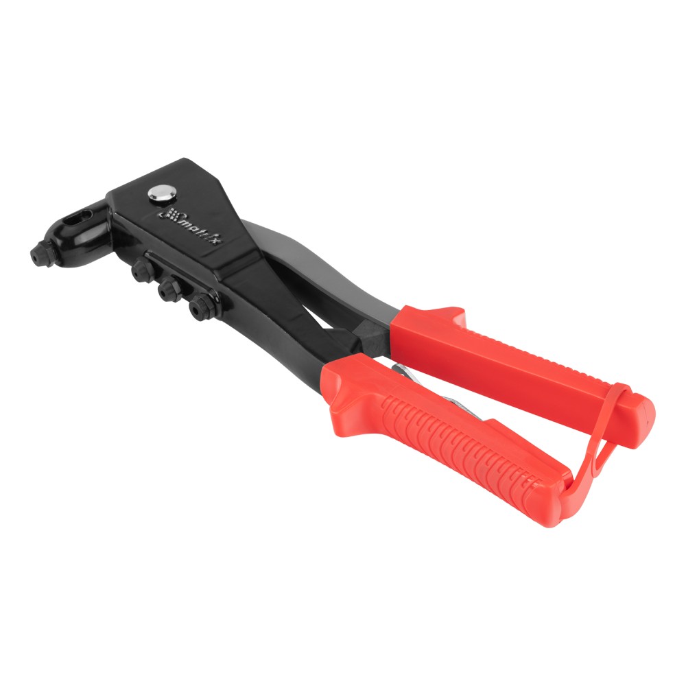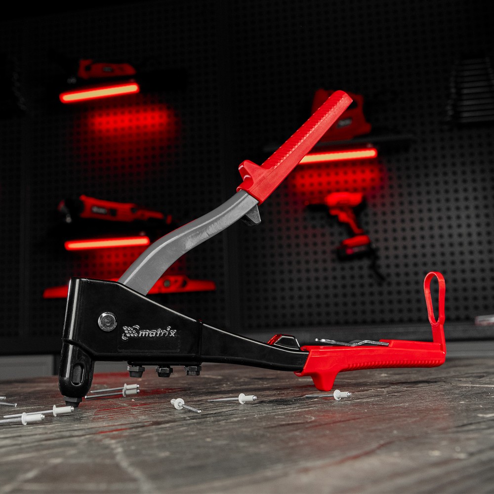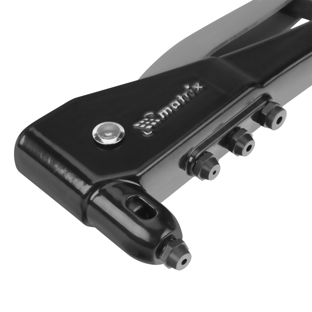 Литой заклепочник Matrix 40551 длиной 260 мм формирует прочные неразъемные соединения металлических листов и профилей. Используется с заклепками диаметром 2,4-3,2-4,0-4,8 мм, для которых предусмотрены сменные насадки соответствующих размеров. Инструмент применяется в строительстве, во время ремонта, сборки мебели и техники, а также полезен в быту.ПреимуществаНадежность и долговечность — инструмент изготовлен из алюминиевого сплава, устойчивого к коррозии и повреждениям.Эффективная работа — двухсегментный цанговый механизм из хромомолибденовой стали крепко захватывает вытяжную шпильку заклепки.Удобное хранение сменных насадок — для них предусмотрены специальные гнезда на корпусе.Фиксация рукояток в нерабочем положении — инструмент удобен для хранения и транспортировки.Комфортная работа — рифленые рукоятки не выскальзывают из ладони.