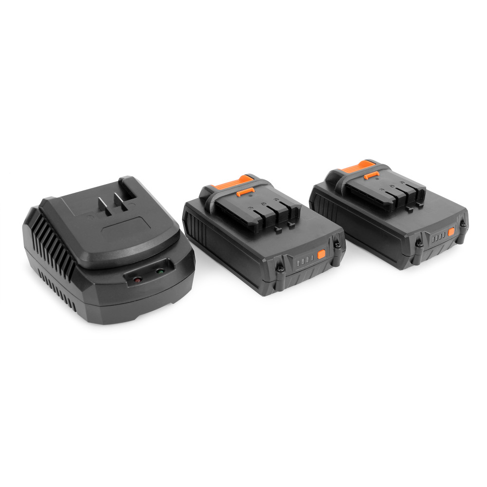 В комплект входят два Li-Ion аккумулятора с напряжением 18 В и емкостью 2 Ач , а также зарядное устройство. Время зарядки: 60 мин.