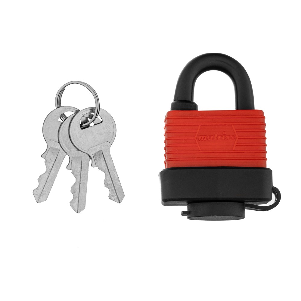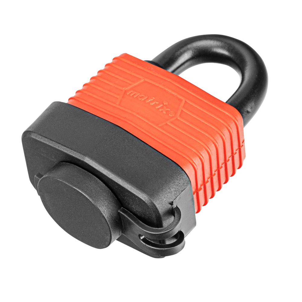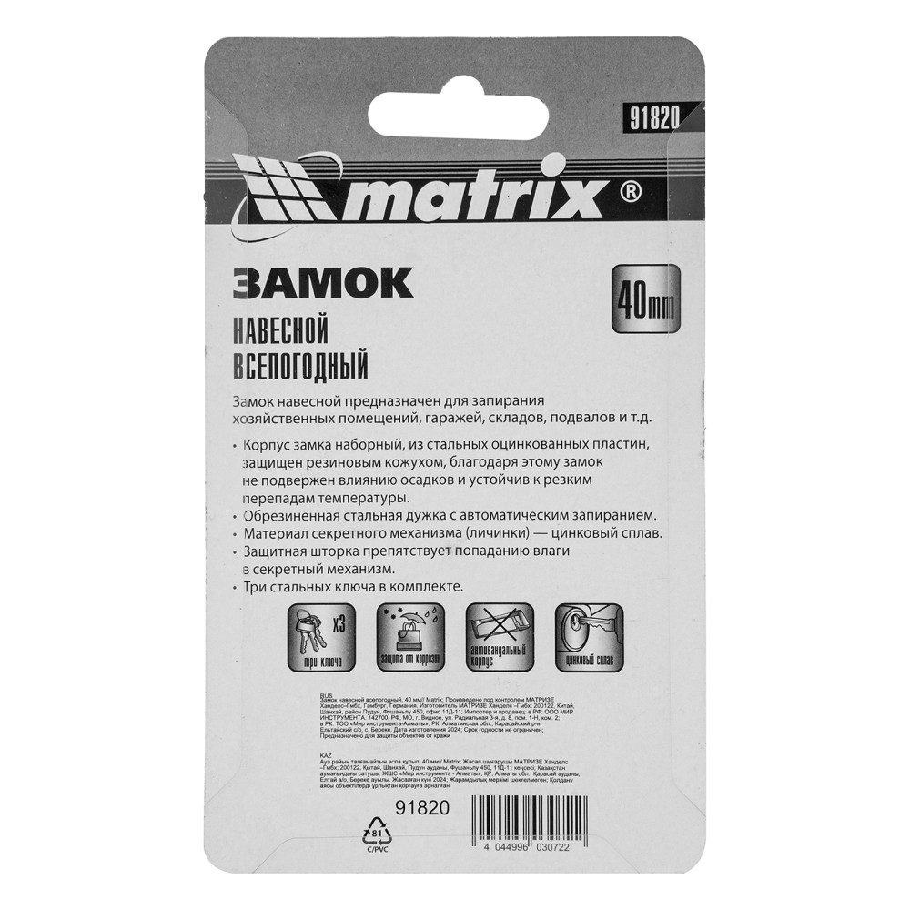 Навесной всепогодный замок Matrix 91820 шириной 40 мм вешается на дверь и обеспечивает сохранность имущества. Поможет защитить от несанкционированного проникновения сарай, гараж, подвал и другие помещения.ПреимуществаВзломостойкость — благодаря закаленной стальной дужке и стальному корпусу сложной конструкции замок трудно вскрыть.Герметичность — корпус имеет прорезиненное покрытие, а ключевой блок защищен от попадания влаги специальной крышкой.Высокое качество исполнения — зазоры между деталями замка минимальны, что увеличивает надежность конструкции.