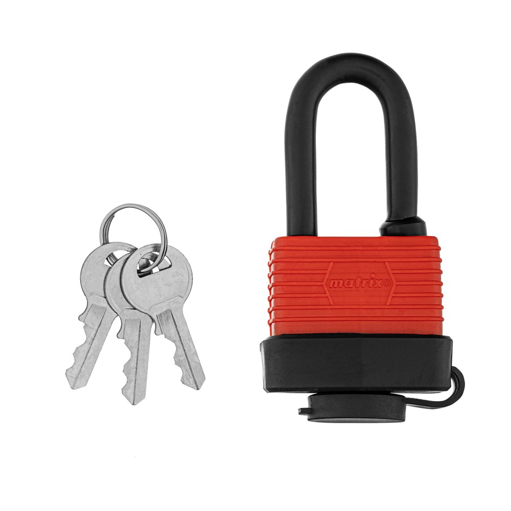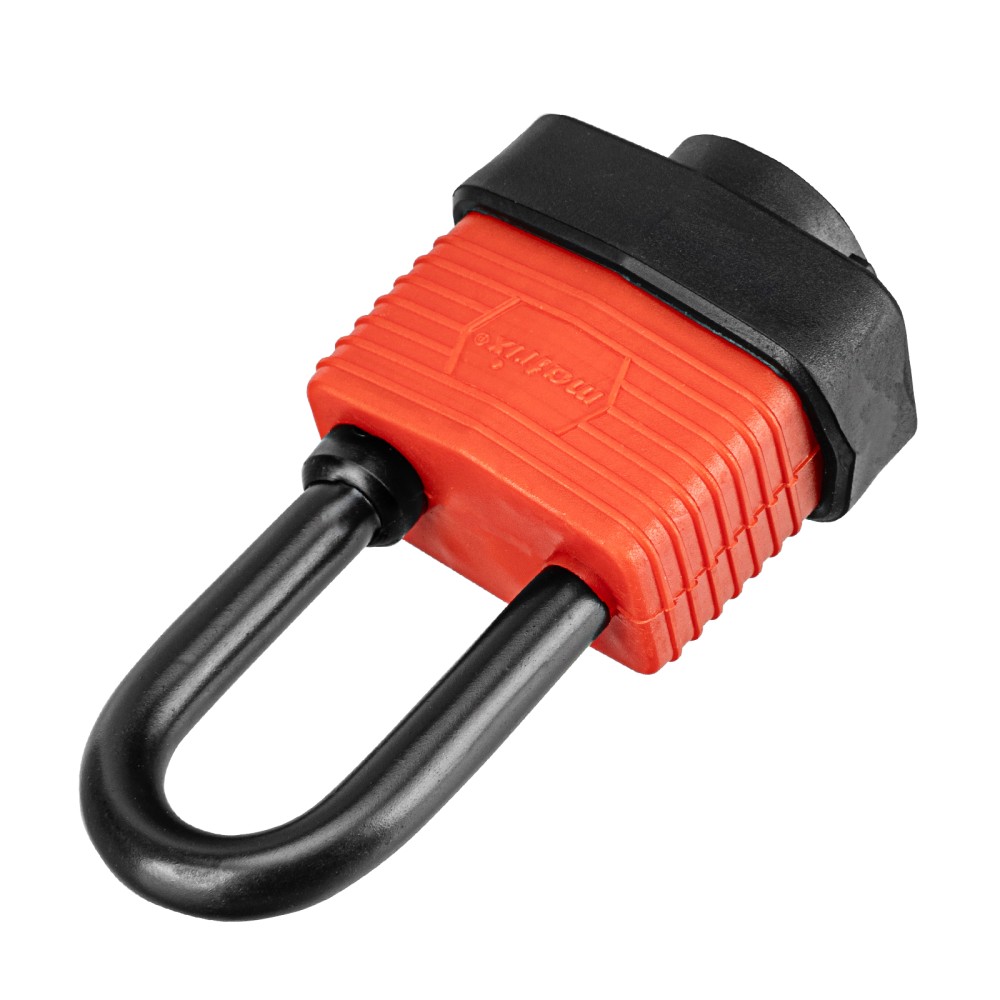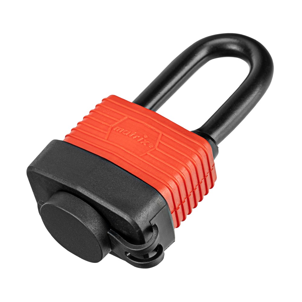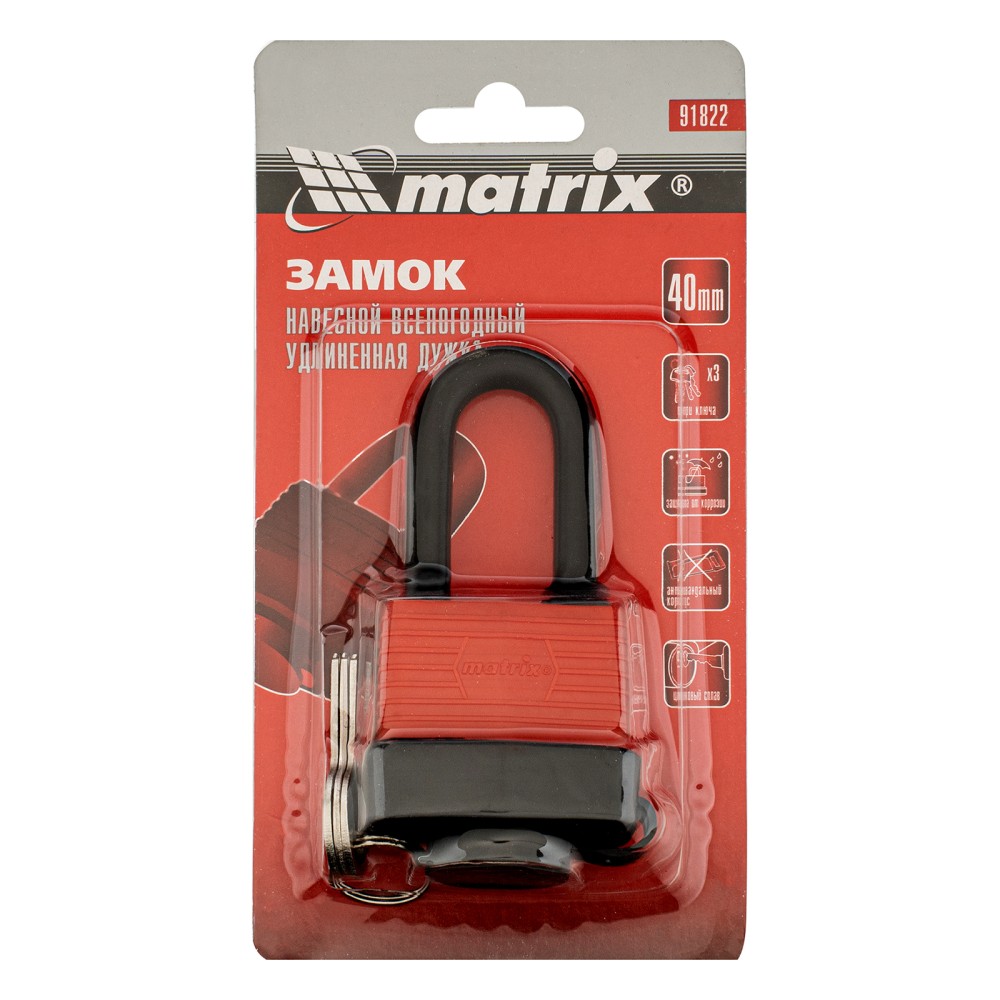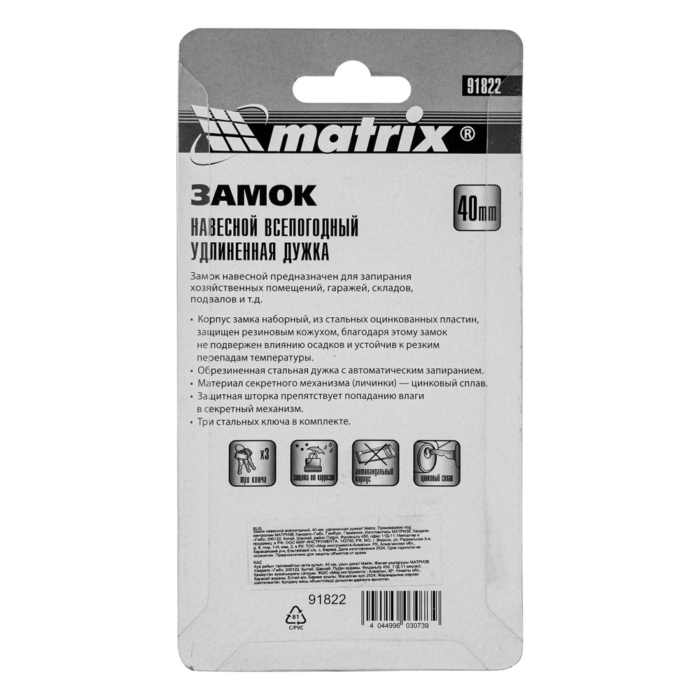 Навесной всепогодный замок Matrix 91822 шириной 40 мм, с удлиненной дужкой, вешается на дверь и обеспечивает сохранность имущества. Поможет защитить от несанкционированного проникновения сарай, гараж, подвал и другие помещения, подходит для высоких запорных петель.ПреимуществаВзломостойкость — благодаря закаленной стальной дужке и стальному корпусу сложной конструкции замок трудно вскрыть.Герметичность — корпус имеет прорезиненное покрытие, а ключевой блок защищен от попадания влаги специальной крышкой.Высокое качество исполнения — зазоры между деталями замка минимальны, что увеличивает надежность конструкции.