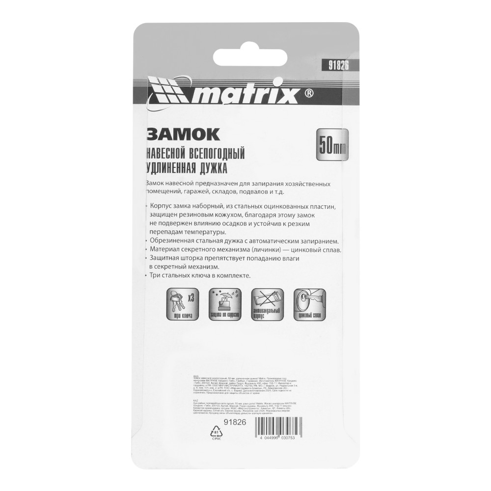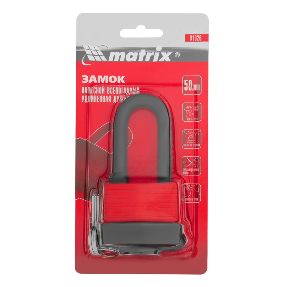 Навесной всепогодный замок Matrix 91826 шириной 50 мм, с удлиненной дужкой, вешается на дверь и обеспечивает сохранность имущества. Поможет защитить от несанкционированного проникновения сарай, гараж, подвал и другие помещения, подходит для высоких запорных петель.ПреимуществаВзломостойкость — благодаря закаленной стальной дужке и стальному корпусу сложной конструкции замок трудно вскрыть.Герметичность — корпус имеет прорезиненное покрытие, а ключевой блок защищен от попадания влаги специальной крышкой.Высокое качество исполнения — зазоры между деталями замка минимальны, что увеличивает надежность конструкции.