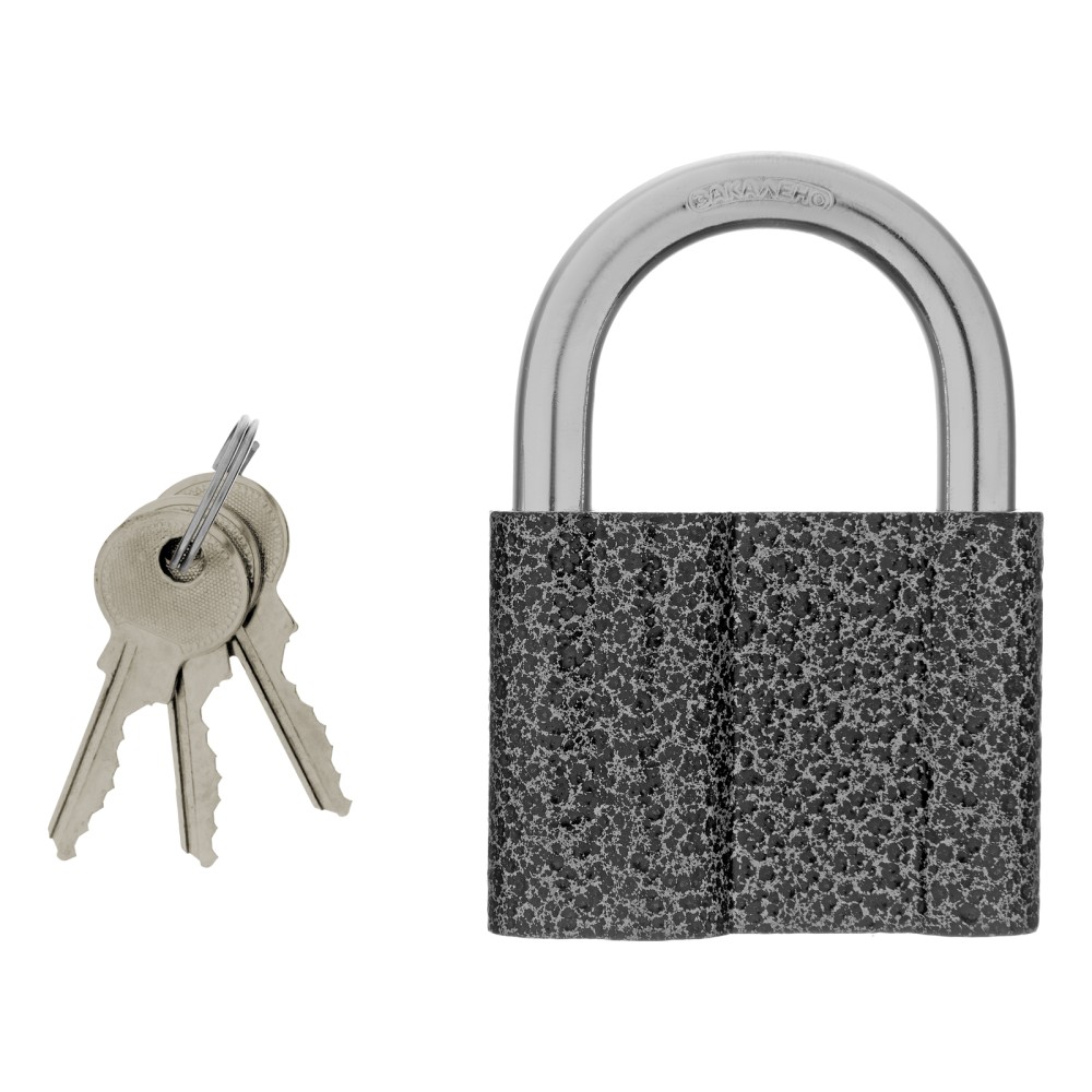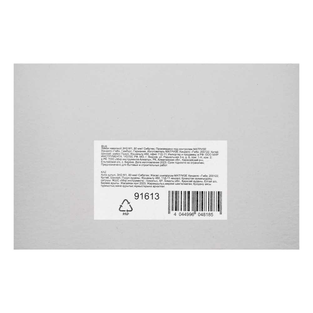 Навесной замок Сибртех ЗН2-М1 91613 шириной 80 мм служит для защиты помещений от взлома. Для его установки и эксплуатации не требуются специальные навыки и инструменты. Замок с открытой конструкцией подходит для любых проушин. ПреимуществаКоррозионная стойкость — корпус изготовлен из алюминиевого сплава.Устойчивость к взлому — в замке установлен цилиндровый запорный механизм, дужку толщиной 11 мм из закаленной стали трудно спилить.Расширенная комплектация — в комплект поставки входит 3 ключа, поэтому делать дубликаты не потребуется.
