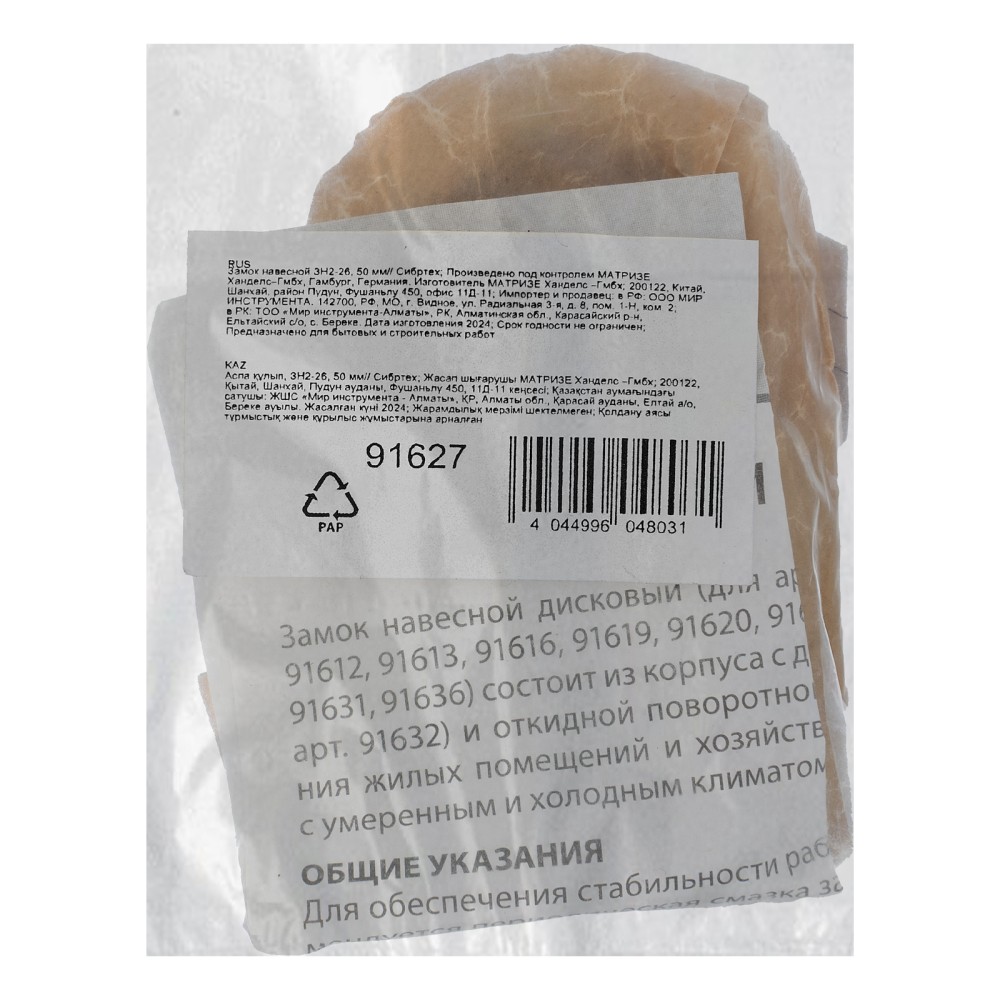 Навесной замок Сибртех ЗН2-26 91627 шириной 50 мм — запорное устройство для установки на дверные проушины. Защищает помещение от нежелательного проникновения. Замок можно повесить на дверь бытовки, склада, контейнера или гаража.ПреимуществаНадежная защита от взлома — замок имеет прочный чугунный корпус и стальную дужку, дисковый запорный механизм осложняет подбор отмычки.Коррозионная стойкость — на корпус нанесено защитное лакокрасочное покрытие.Удобная комплектация — в комплект поставки входит 3 ключа, что избавляет от необходимости изготовления дубликатов.